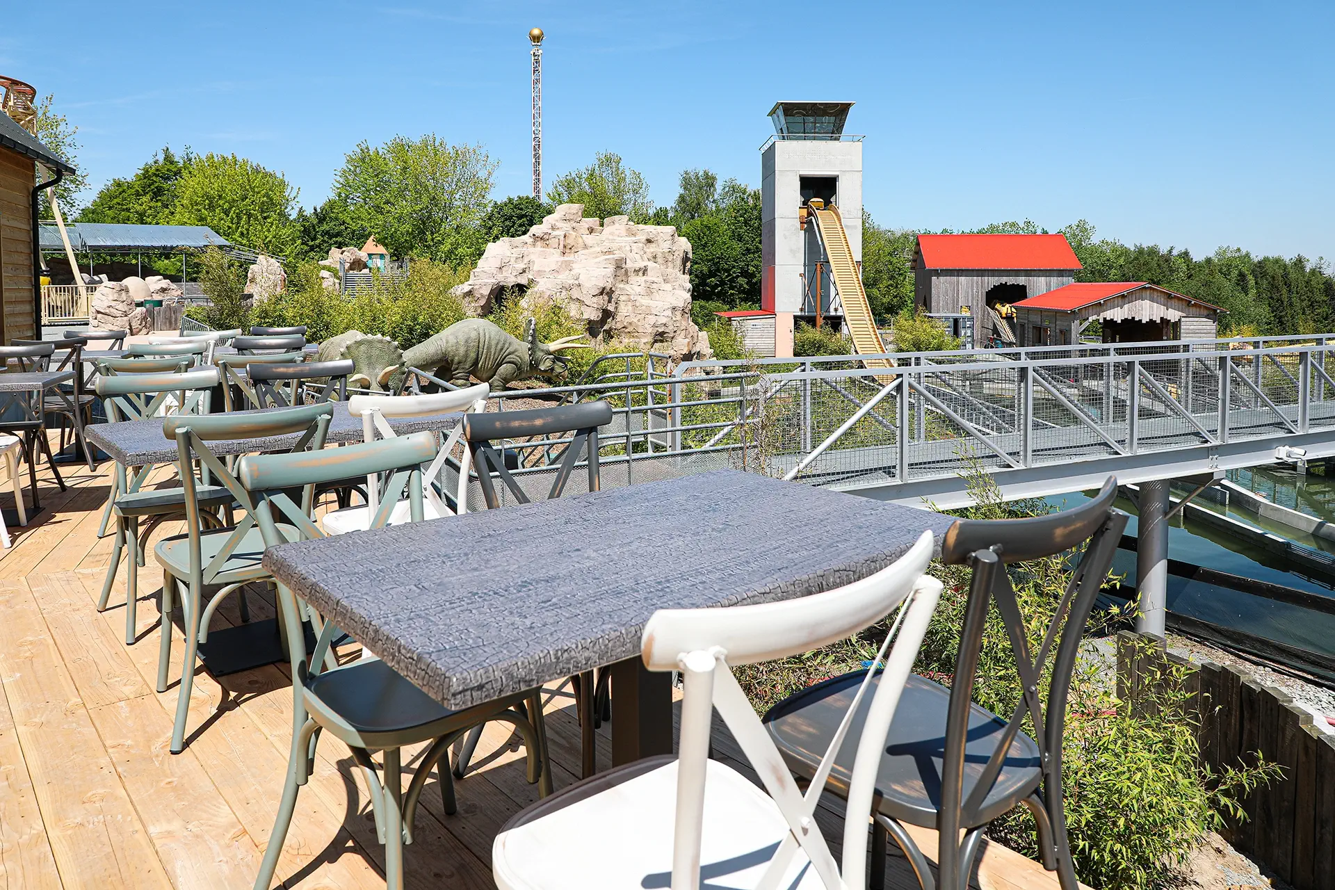 Après un tour de Jurassic Twister, reprenez des forces avec un bon burger et profitez d’une vue magnifique sur le Splash-O-Saure et Orochi.